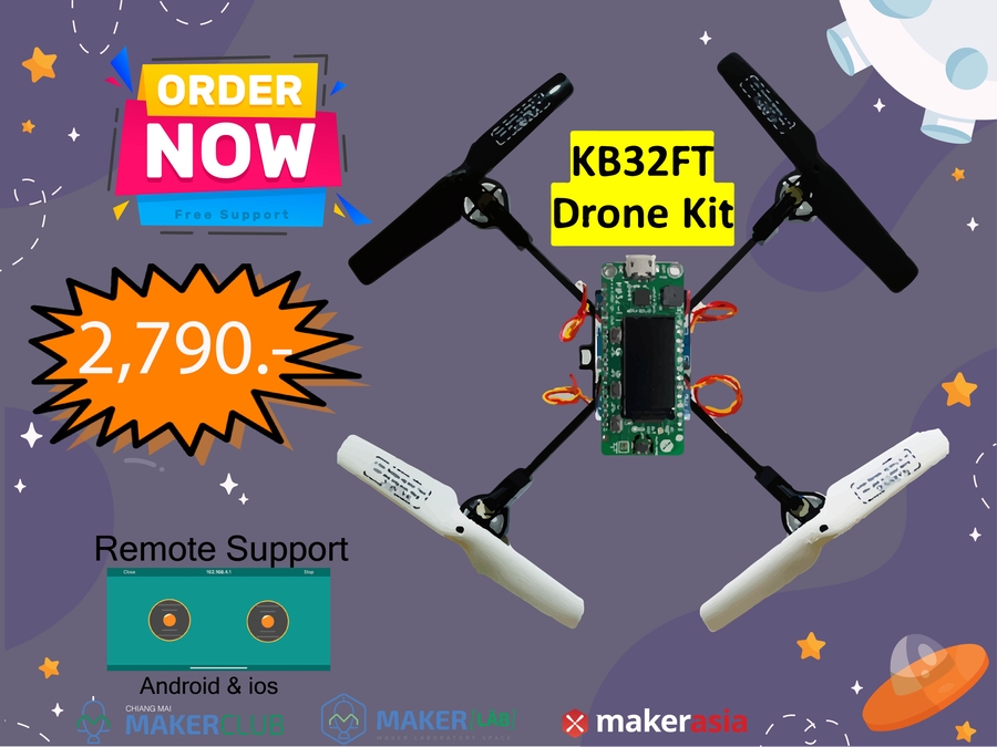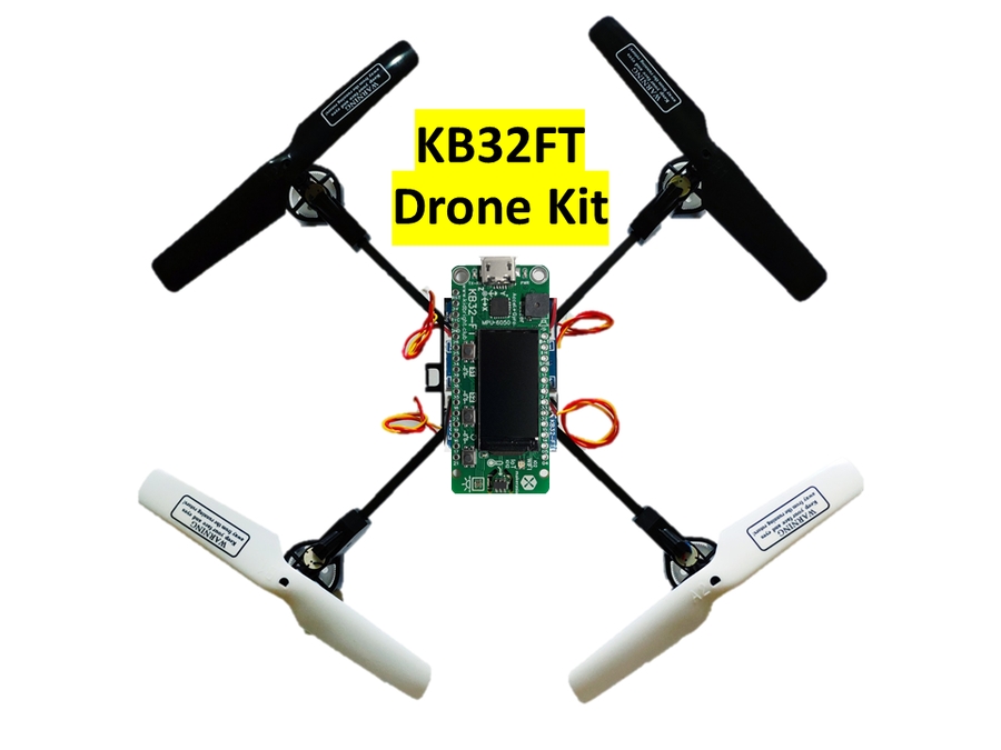 KB32-FT เป็นบอร์ด Microcontroller ขนาดเล็กที่มี WiFi , Bluetooth, จอ TFT LCD และอุปกรณ์อื่นๆ เช่น Accelerometer ,Gyrometer, Buzzer, Temperature sensor, Light sensor, Realtime Clockโดยตัวบอร์ด KB32-FT นั้นมีขาที่ compatible กับบอร์ด Adafruit Feather และยังมี Breakout Board ที่ทำให้ บอร์ด KB32-FT นั้น compatible กับบอร์ด KIDBRIGHT32 V1.5 อีกด้วย Drone Kit ที่ทำให้การเรียนรู้โดรน 4 ใบพัด กลายเป็นง่าย โดยเป็นการใช้งานร่วมกับบอร์ด KB32-FT Kidbright32 Complatible ของทางบริษัทซึ่งชุดโดรนนี้ได้ทำการ Built-in ตัว Battery charger ทำให้สามารถชาร์จแบตเตอรี่ผ่านพอร์ต Micro USB ได้ทันที และเนื่องจากในบอร์ดเราได้มีการติดตั้งเซ็นเซอร์วัดความสูงเอาไว้แล้ว ทำให้น้อง ๆ และผู้ปกครองสามารถใช้ block programming ควบคุมการบินโดยกำหนดระยะความสูงได้เลย และเนื่องจากบอร์ด KB32-FT นั้นมีจอ TFT LCD ติดตั้งไว้ทางด้านบนของบอร์ดทำให้สามารถแสดงสถานะต่างๆของการบินได้ด้วย ไม่ว่าจะเป็นความสูงระดับแบตเตอรี่ระยะเวลาบินหรือ มุมขณะบิน ซึ่งจะมีตัวอย่างการเขียนโปรแกรมรวมทั้ง Library ที่สามารถมารถพัฒนาต่อยอดได้ง่าย รองรับการเขียนโปรแกรมด้วย Code เช่น Arduino IDE และ Block programming เช่น KidBright IDE, KBIDE เป็นต้น พร้อม Application ในการควบคุมการทำงานด้วยตัวเอง ซึ่งรองรับการใช้งานได้ทั้งฝั่ง Android และ IOS